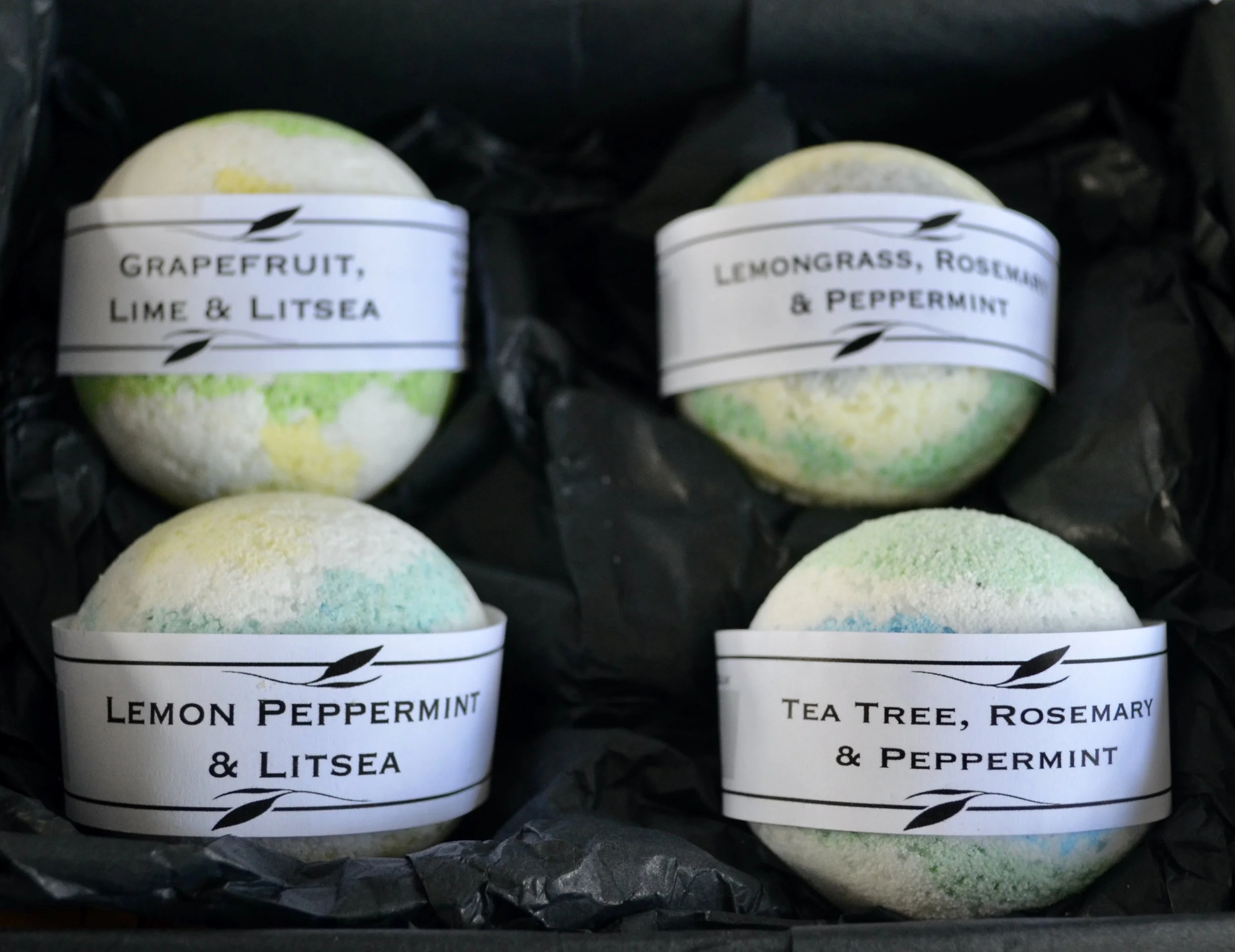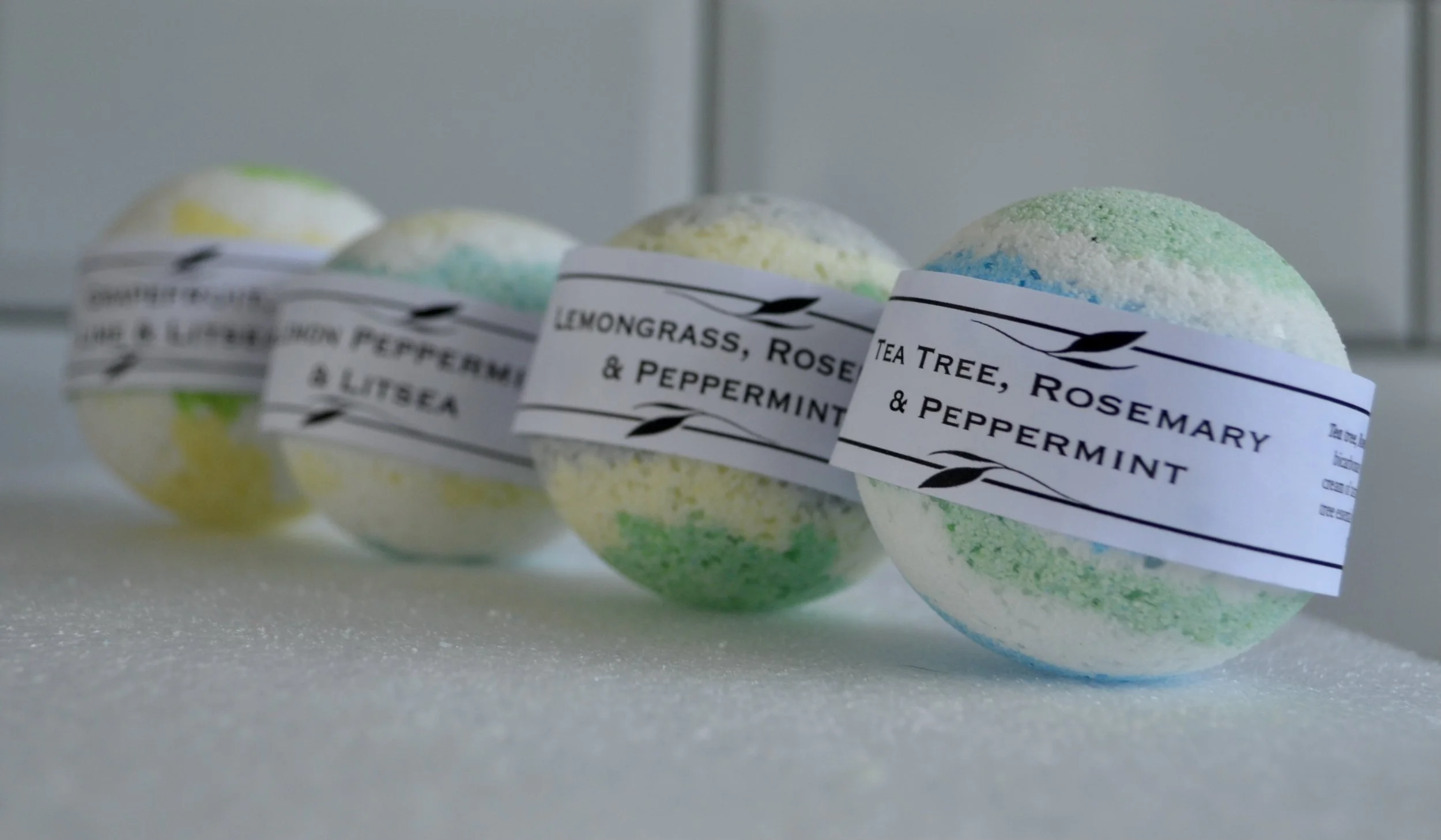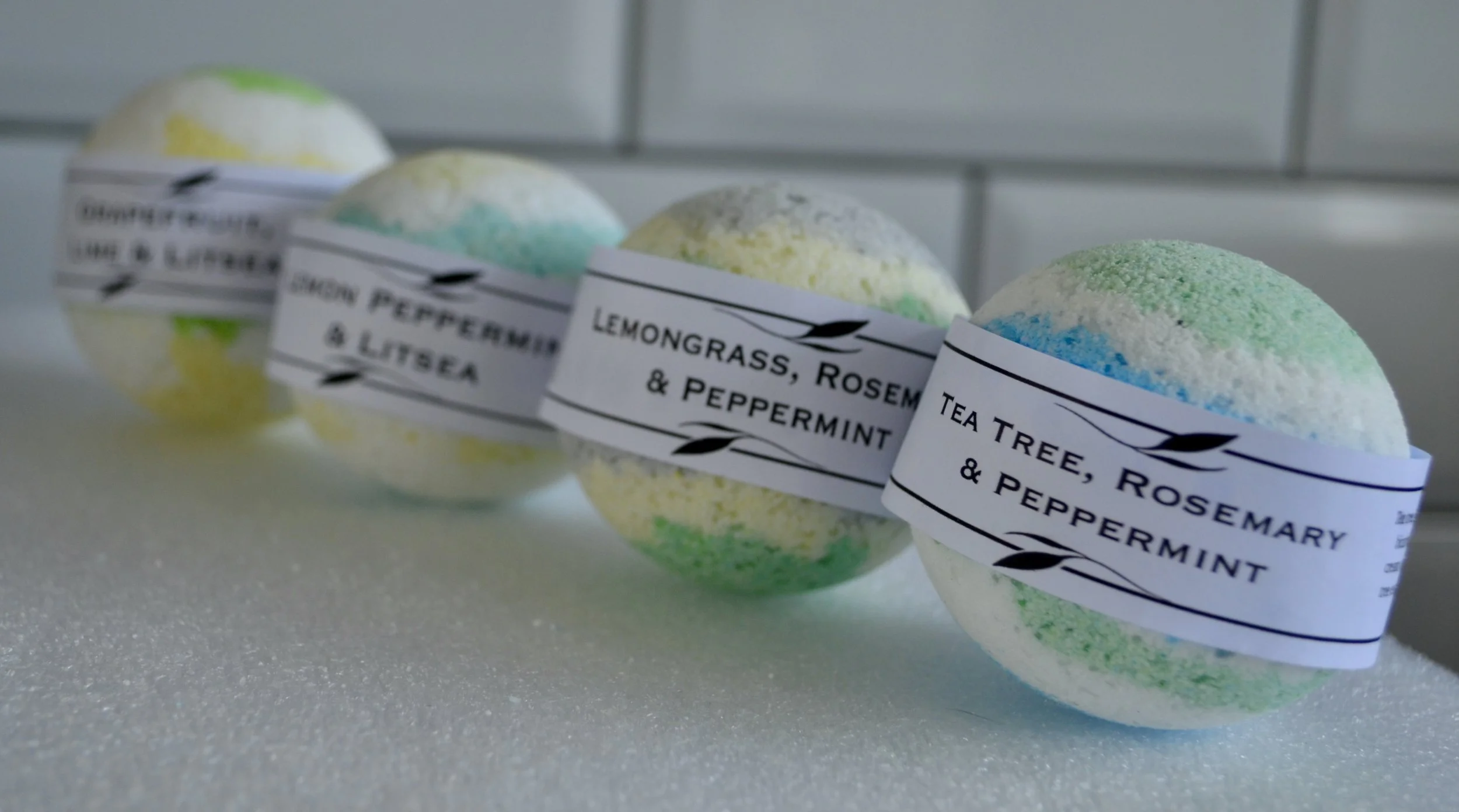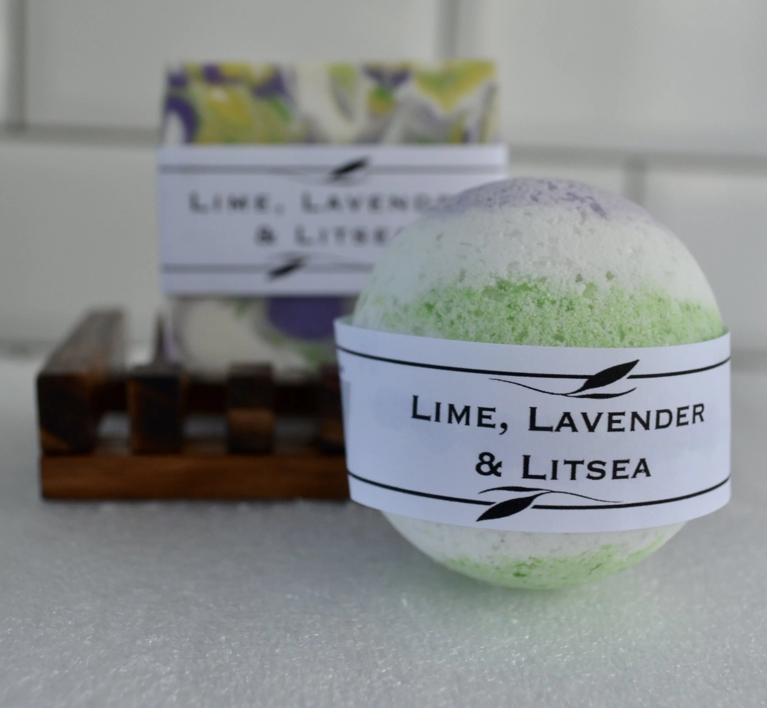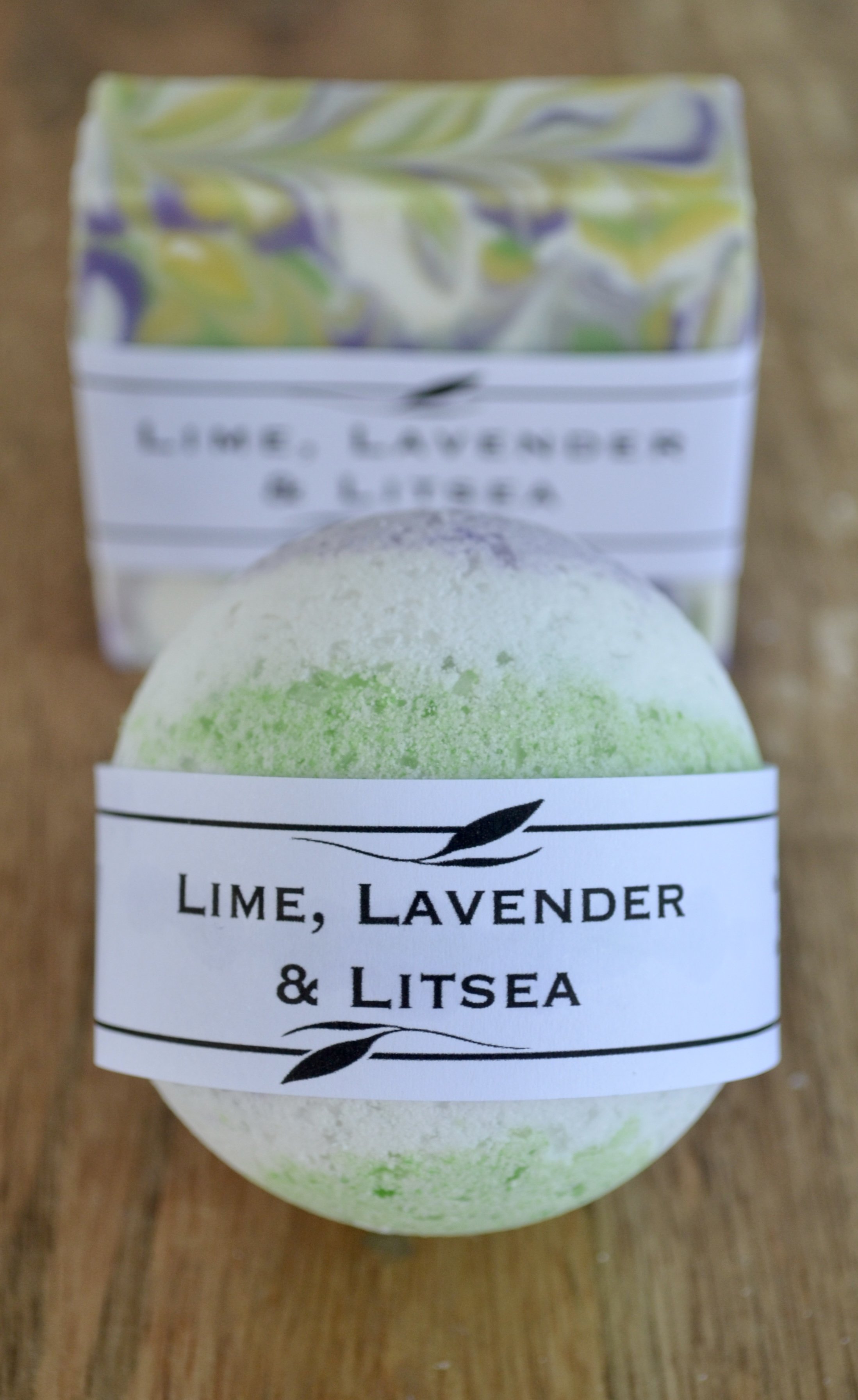 Sodium carbonate, epsom salts, citric acid, sodium lauryl sulfoacetate, potassium bitartrate (cream of tartar), cocos nucifera oil (coconut oil), hamamelis Virginia water (witch hazel), Citrus Aurantifolia (Lime) Essential Oil, (limolene, linalool), Lavandula Angustifolia (Lavender) essential oil, (alpha-terpinene, beta-caryophyllene, camphor, coumarin, eugenol, geranyl acetate, lavendula oil, linalyl acetate, pinene, terpineol, terpinolene),Litsea Cubeba Fruit (Litsea) Essential Oil, (citronellol, geraniol), natural mica colours, Manganese Violet, D&C green no5 FD&C yellow no5.