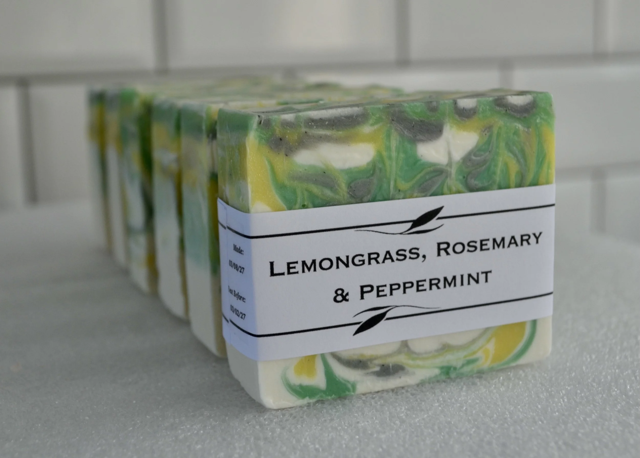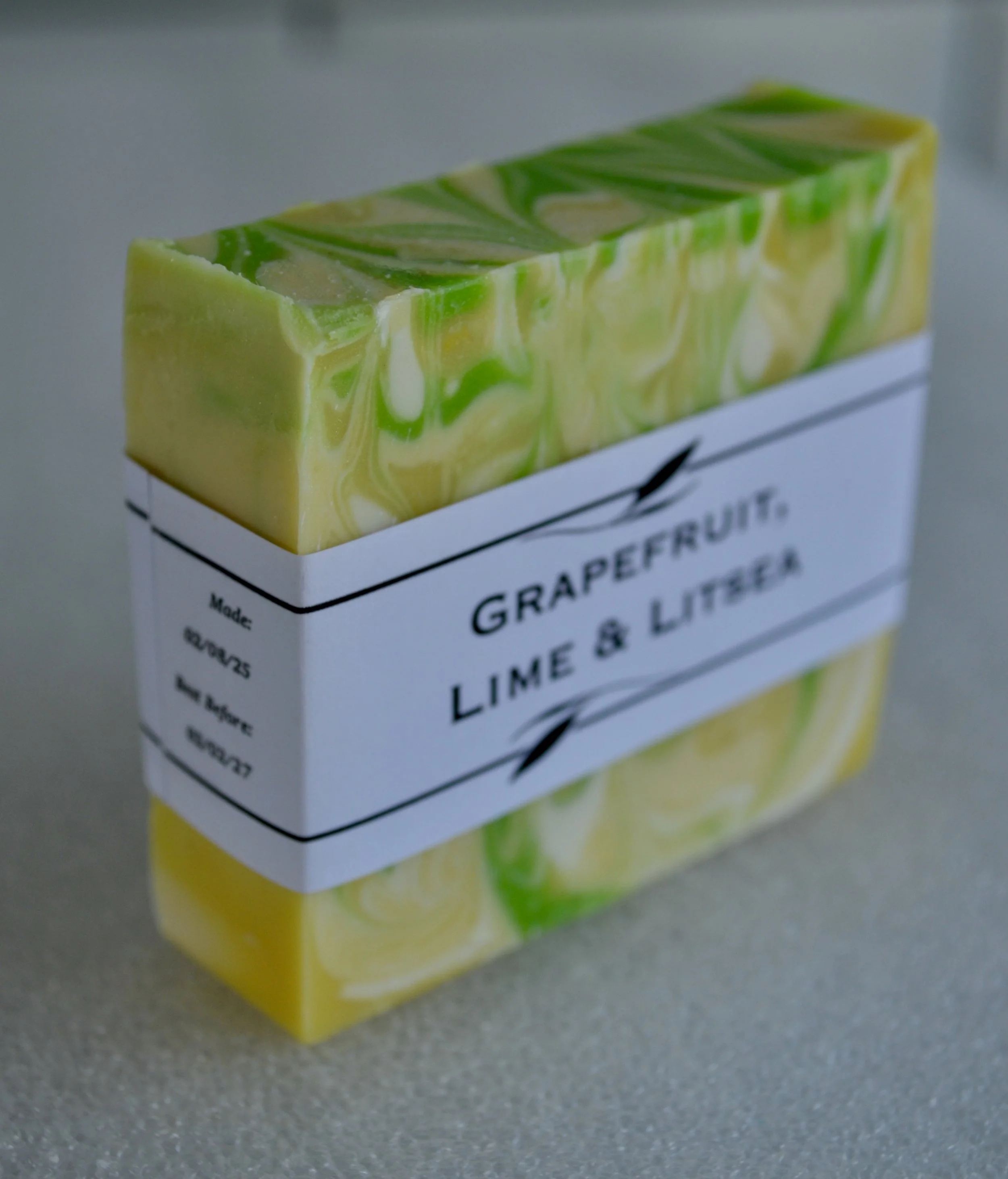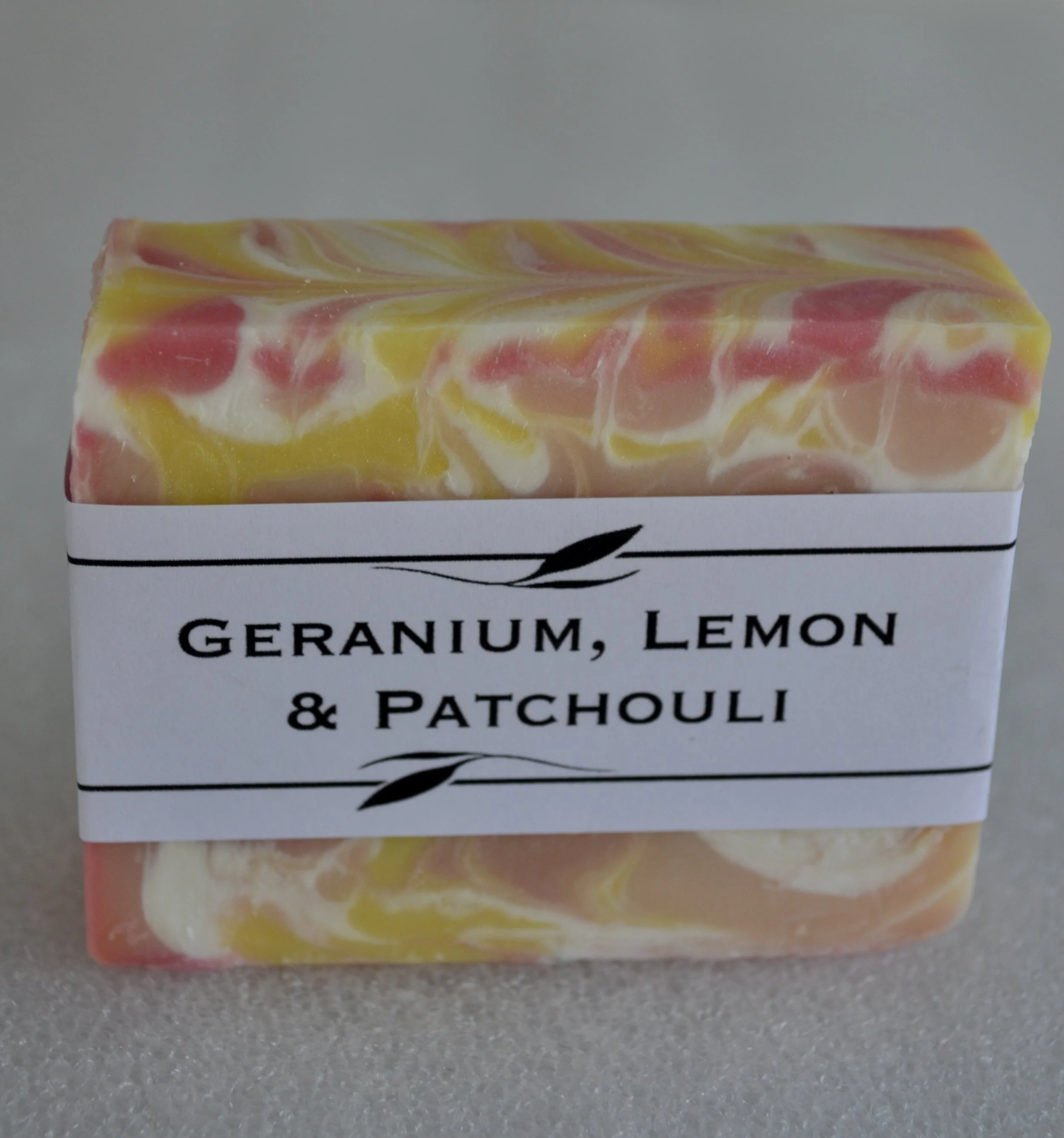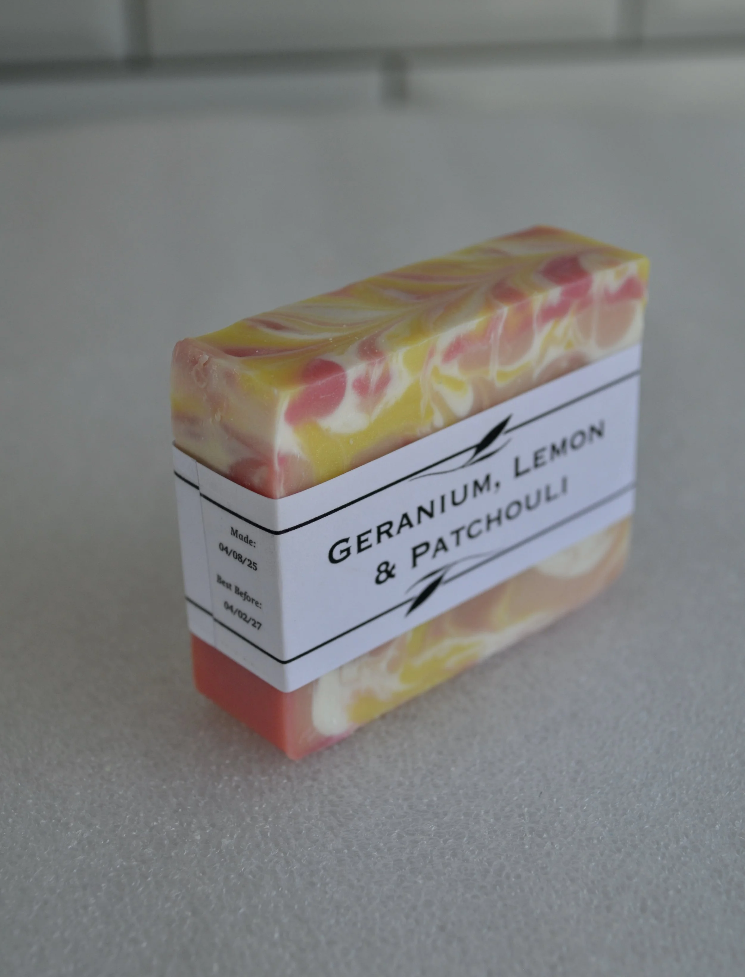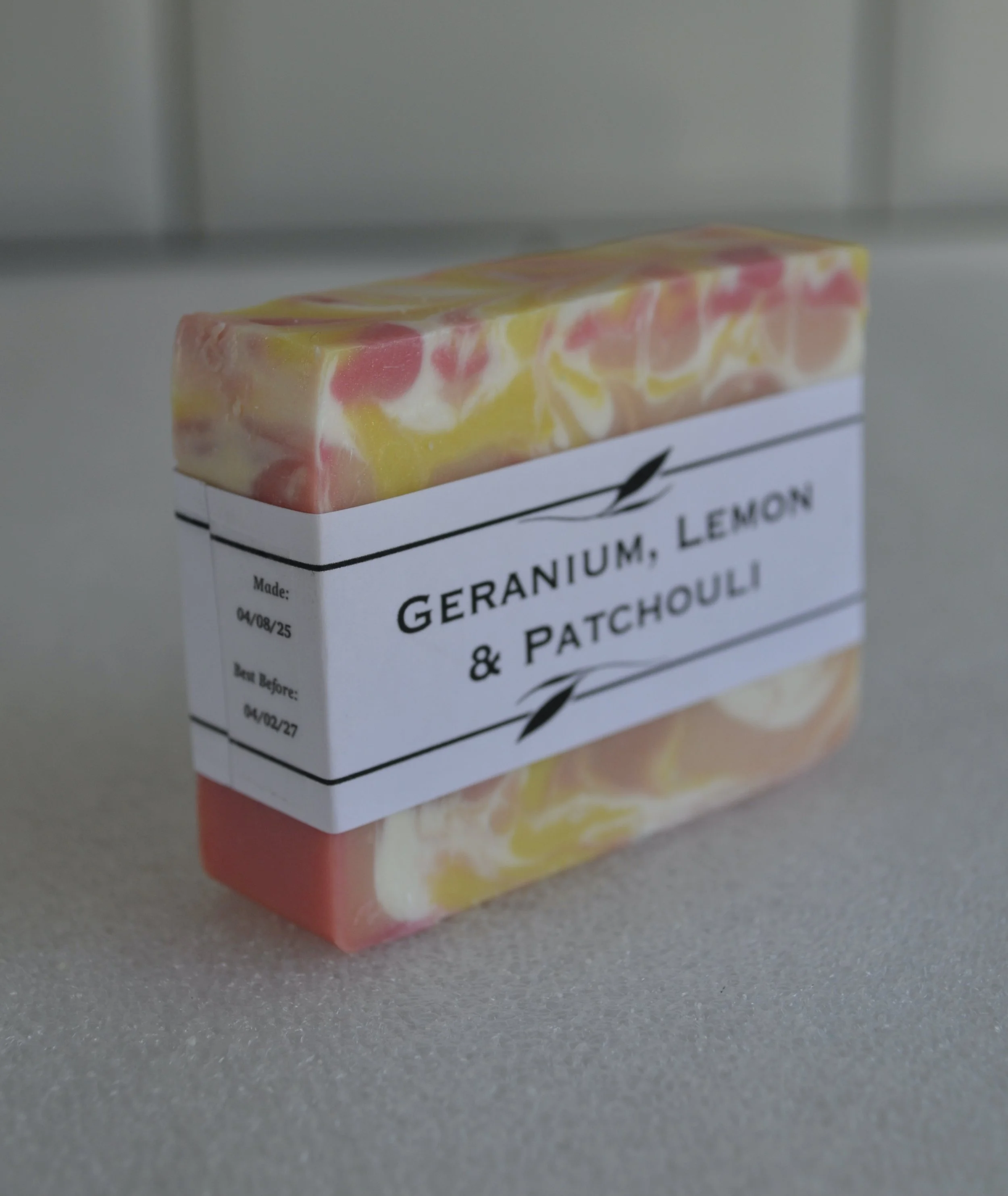 Olea Europara Fruit Oil (Olive oil), water, Cocos Nucifera Oil (coconut oil), Elaeis Guineensis Oil (palm oil - (RSPO)), sodium hydroxide, Ricinus Communis Seed Oil (castor oil), Prunus Amygdalus Dulcis Oil (sweet almond oil), sodium lactate, Pelargonium Graveolens Flower Oil (geranium) Essential oil, (citral, citronellol, geraniol, limonene, linalool), Citrus Limon (Lemon) Peel essential oil, Pogostemon Cablin Oil (patchouli) essential oil, (pogostemon cablin oil), titanium dioxide, natural micas, FD&C yellow no 5, FD&C red no 40.